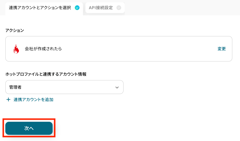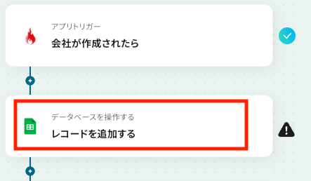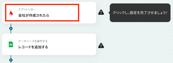 - アクション:テンプレート通りに「会社が作成されたら」を選択します。