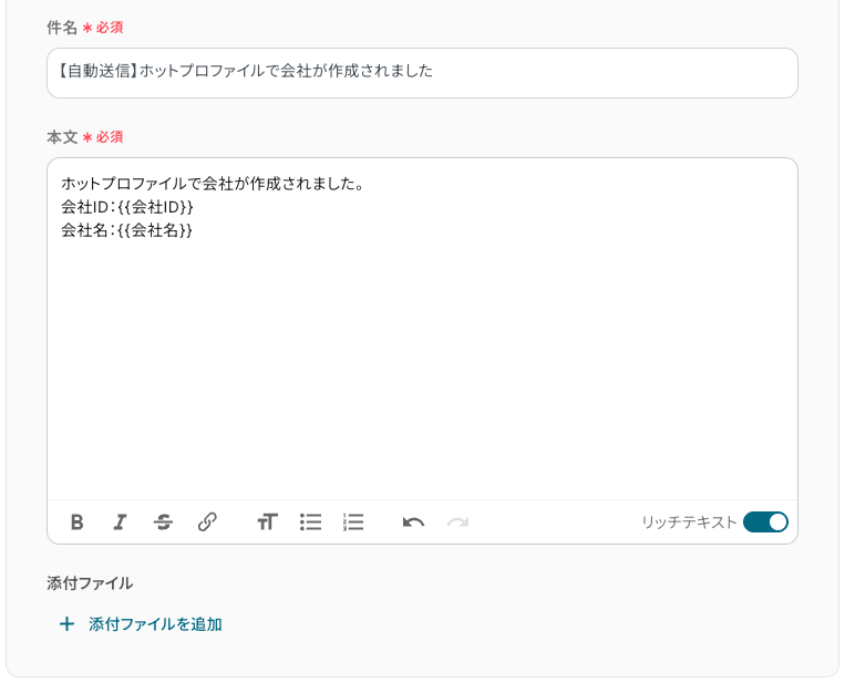 メールの件名や本文も、自社のフォーマットやトーンに合わせて自由にカスタマイズできます。