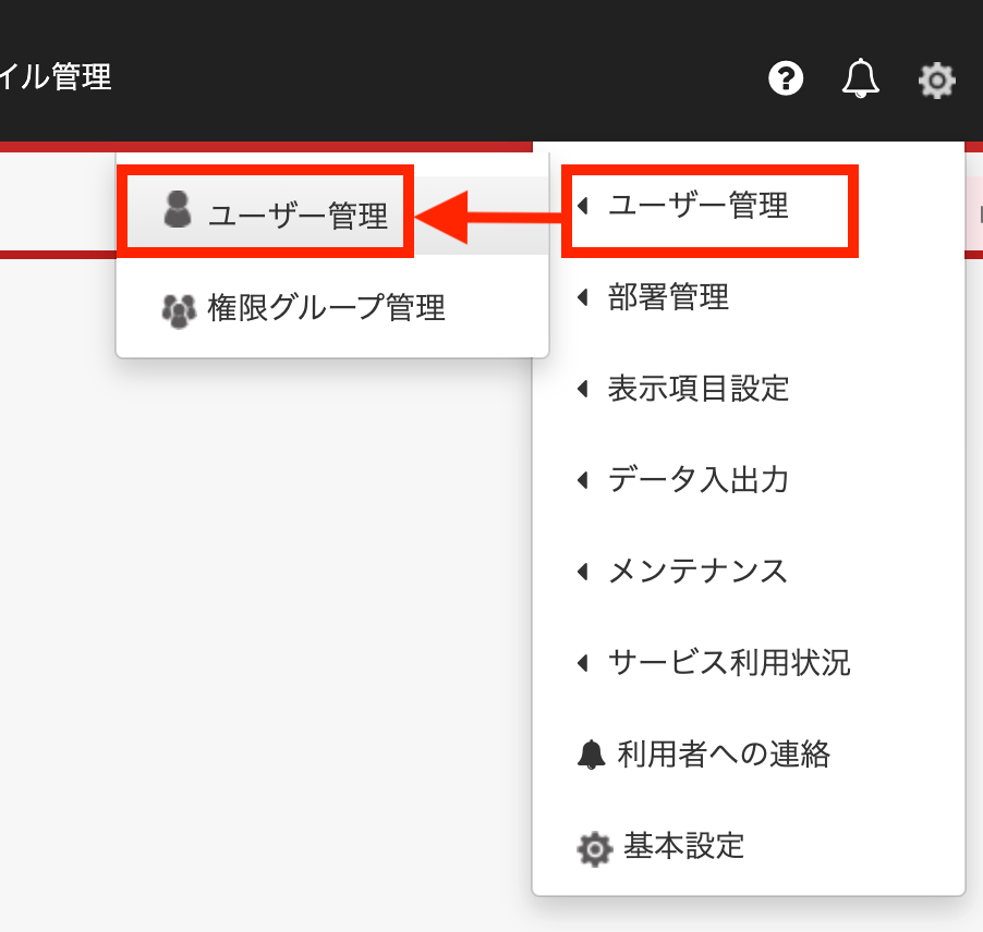 画面右上の歯車アイコンをクリックし、「ユーザー管理」を選択してください。