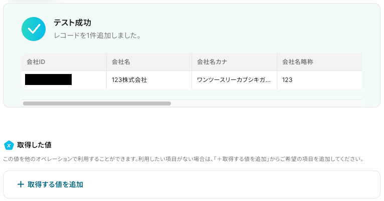 必要に応じて、「+取得する値を追加」ボタンから他のデータを取得することも可能です。