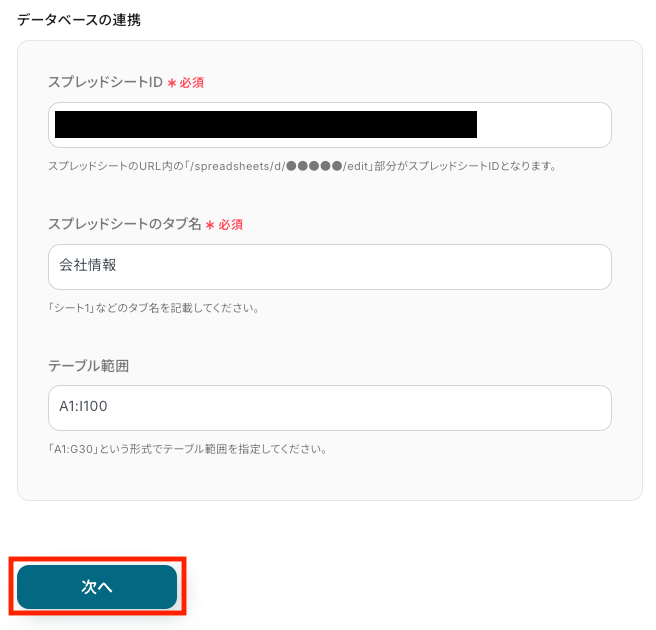 - スプレッドシートID:入力欄の下にある補足説明を参考にしながら入力します。