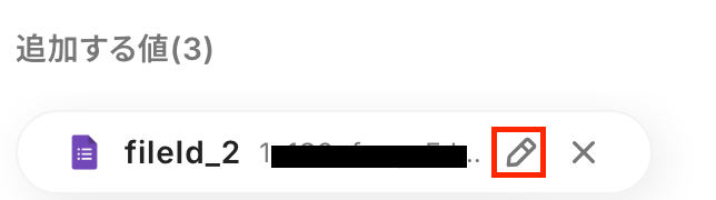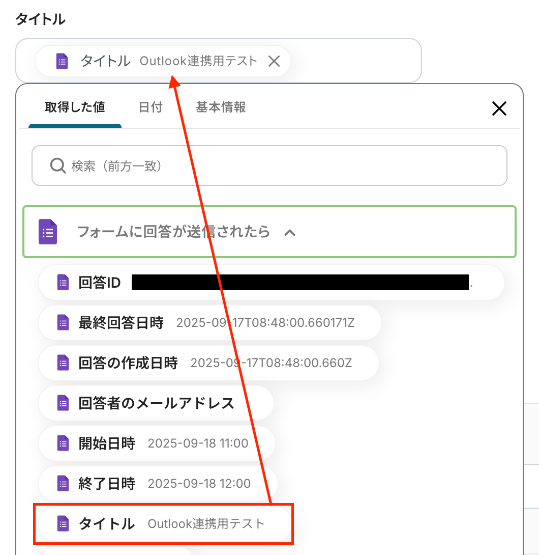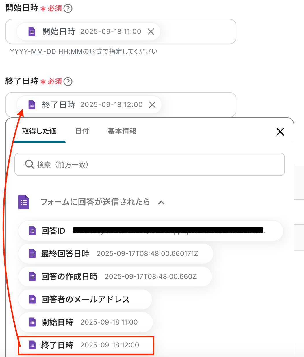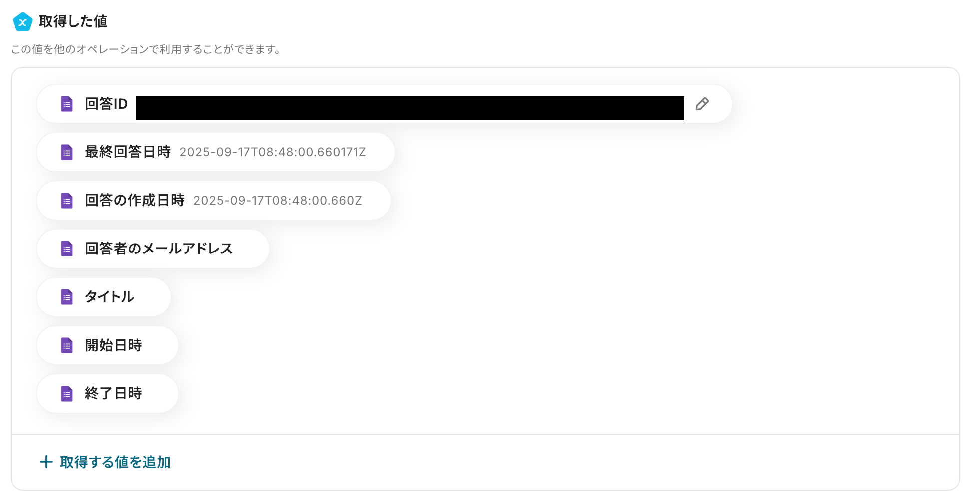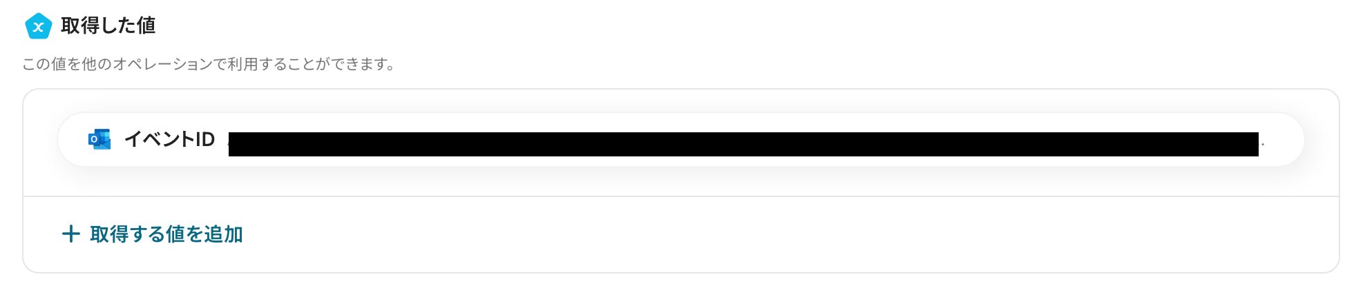 以下の画像では、「タイトル」や「開始日時」などの項目横にアウトプットが表示されていません。このような場合、「取得する値を追加」をクリックしましょう!