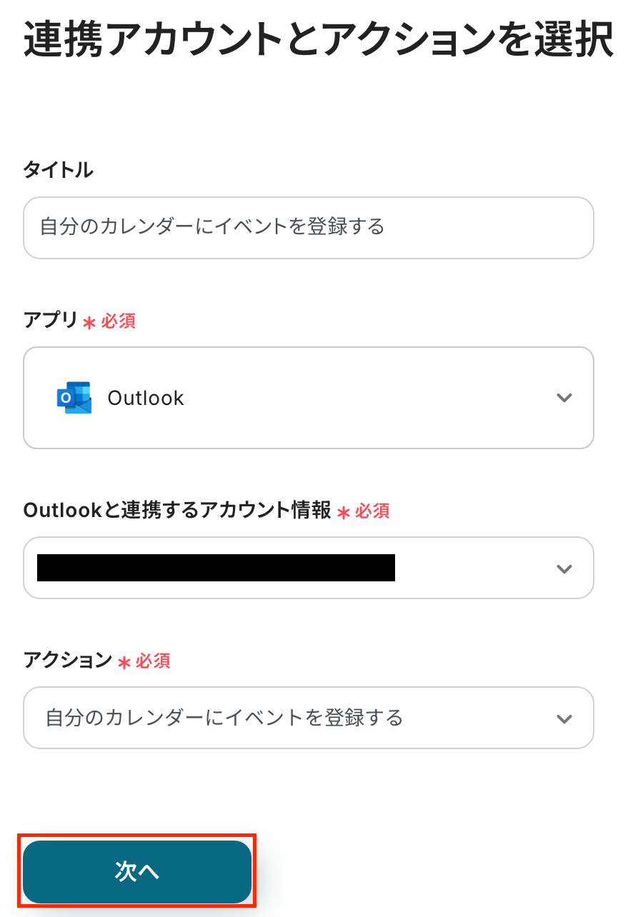 - アクション:「自分のカレンダーにイベントを登録する」を選択