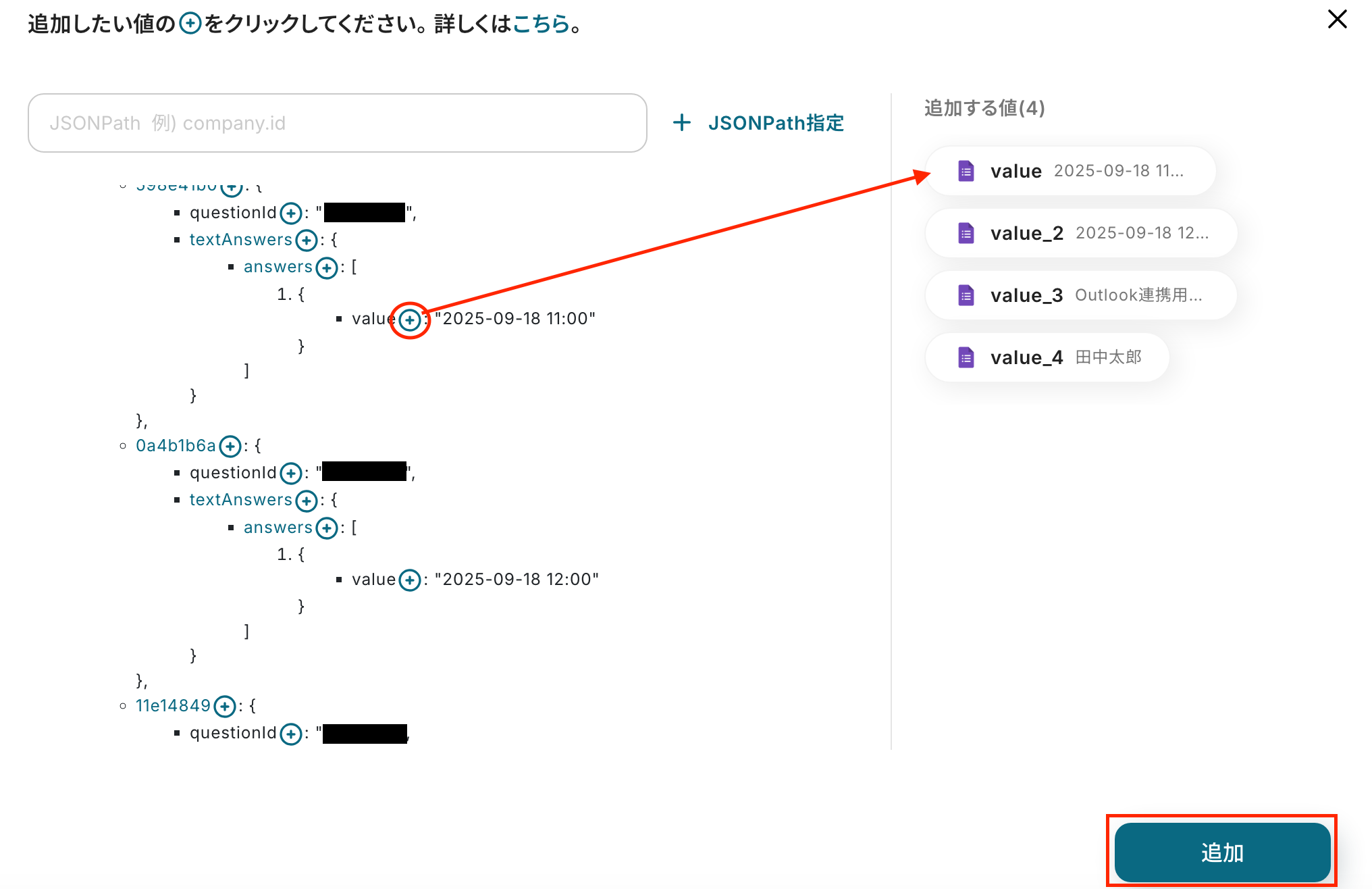 追加したい情報の横にある「+」マークをクリックし、「追加」をクリックしてください。