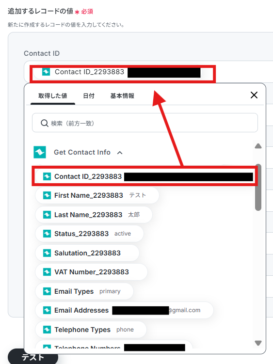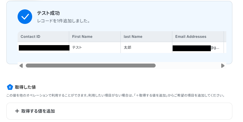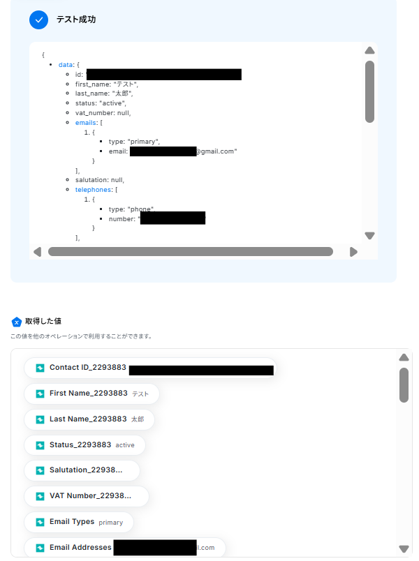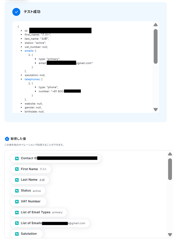 テストが成功し、Contactの詳細情報が取得した値に入ればOKです。