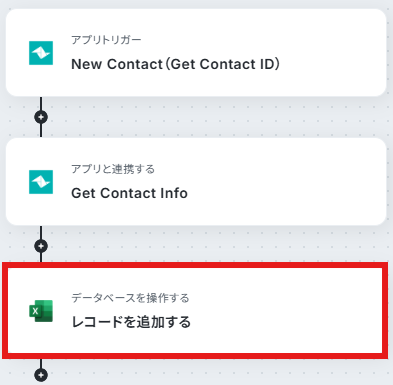 - 最後に、オペレーションでMicrosoft Excelの「レコードを追加する」アクションを設定し、取得したコンタクト情報を指定のファイルに追加します。