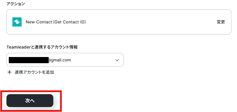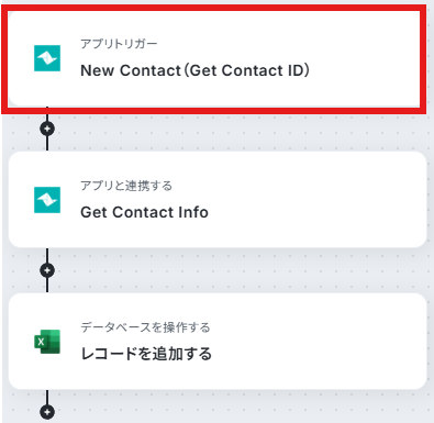 - 次に、トリガーでTeamleaderを選択し、「新しいコンタクトが作成されたら」というアクションを設定してコンタクトIDを取得します。