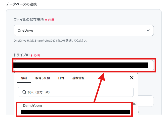 ファイルの保存方法は今回「OneDrive」としています。ドライブIDは候補より選択してください。