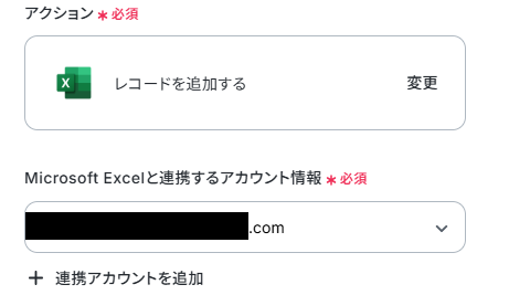 アクションはデフォルト設定のまま、アカウント情報は、連携したいアカウントが選択されているか確認してください。