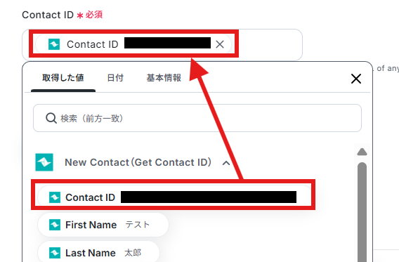 - 続いて、オペレーションでTeamleaderの「コンタクト情報を取得する」アクションを設定し、トリガーで取得したIDを基に詳細情報を取得します。