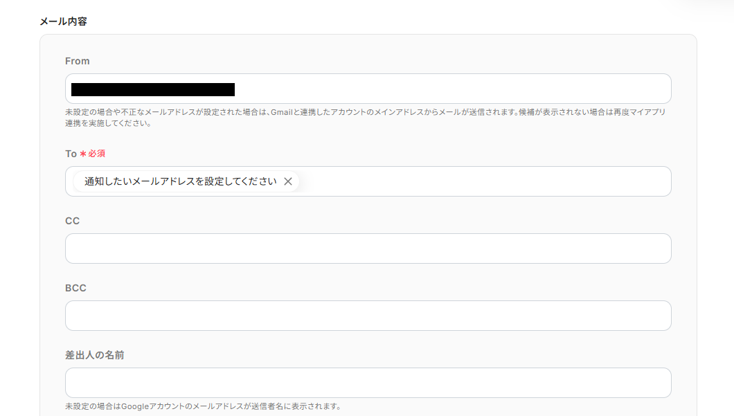 - CC/BCC:To以外に通知したい人のメールアドレス