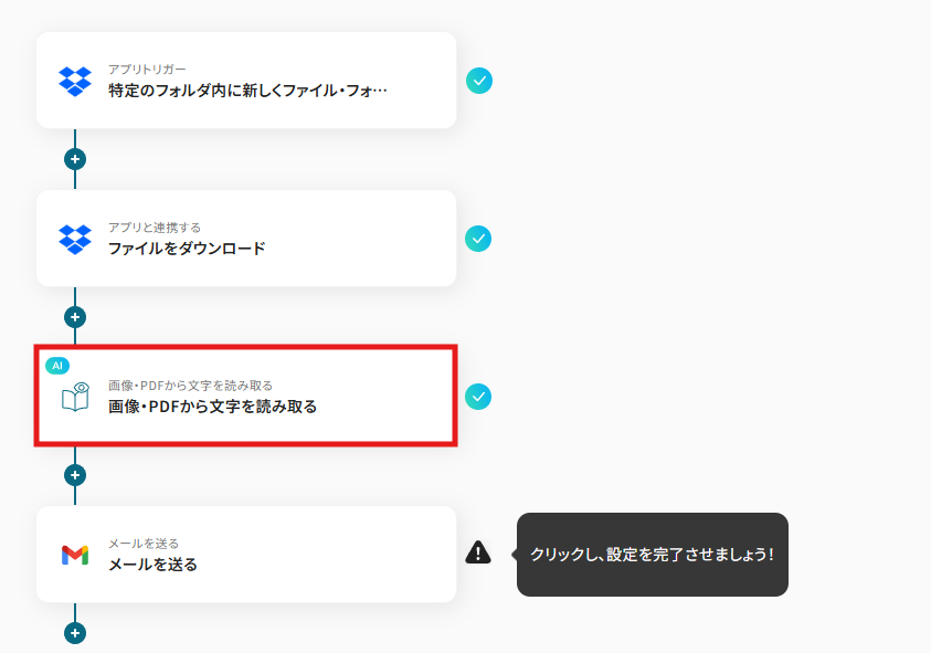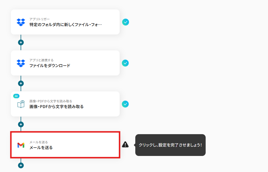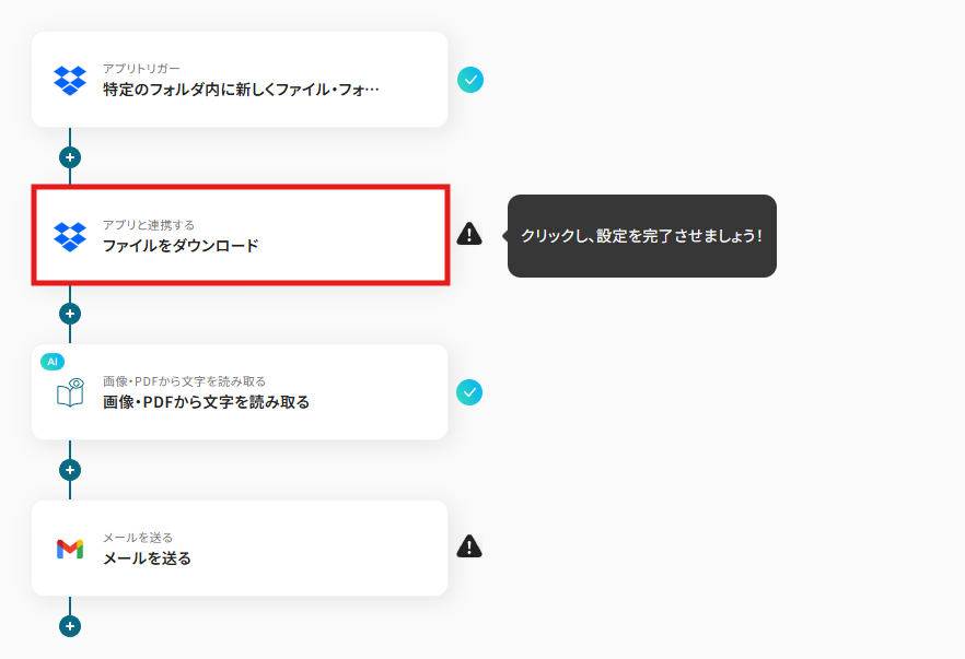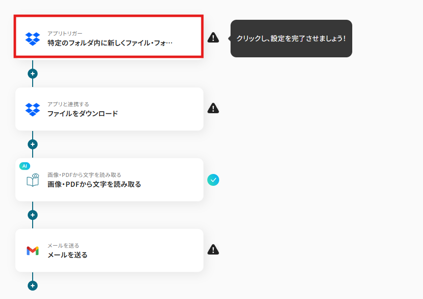 - Dropboxのトリガー設定とOCR、Gmailのアクション設定