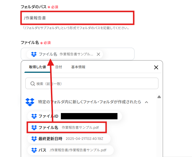 「取得した値」の「特定のフォルダ内に新しくファイル・フォルダが作成されたら」から、「ファイル名」を選択することで、自動でファイル名を参照できます。