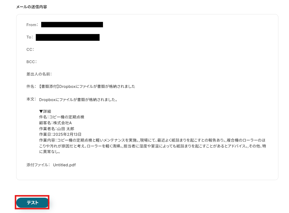 実際に画像やPDFを設定したフォルダにアップロードした後に、「テスト」をクリックしてテストを実行してみましょう。