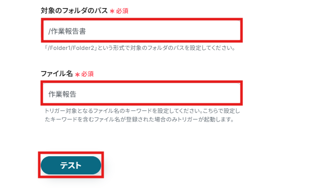 (4)「対象のフォルダのパス」と「ファイル名」に、アップロードされたファイルが格納されるフォルダのパスとファイル名を手動で設定しましょう。