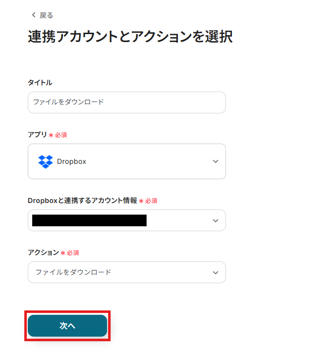 (2)Dropboxと連携するアカウント情報を任意に設定し、アクションはテンプレート通りに「ファイルをダウンロードする」のまま「次へ」をクリックして進んでください。