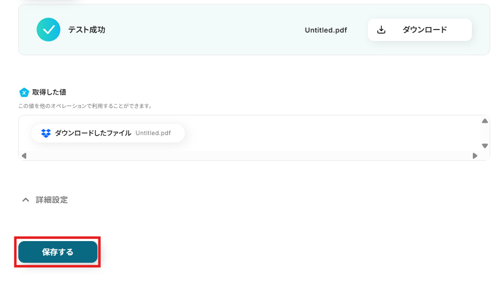 (8)テストが成功し、「取得した値」に画像・PDFの情報が抽出されているか確認しましょう。