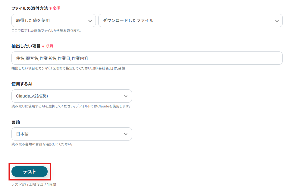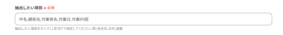 請求書を読み取りたい場合は「会社名,領収金額,日付,消費税・・・」、作業報告書を読み取りたい場合は「件名,顧客名,作業者名,作業日,作業内容・・・」など、読み取りたいファイルに合わせて抽出項目を設定しましょう。