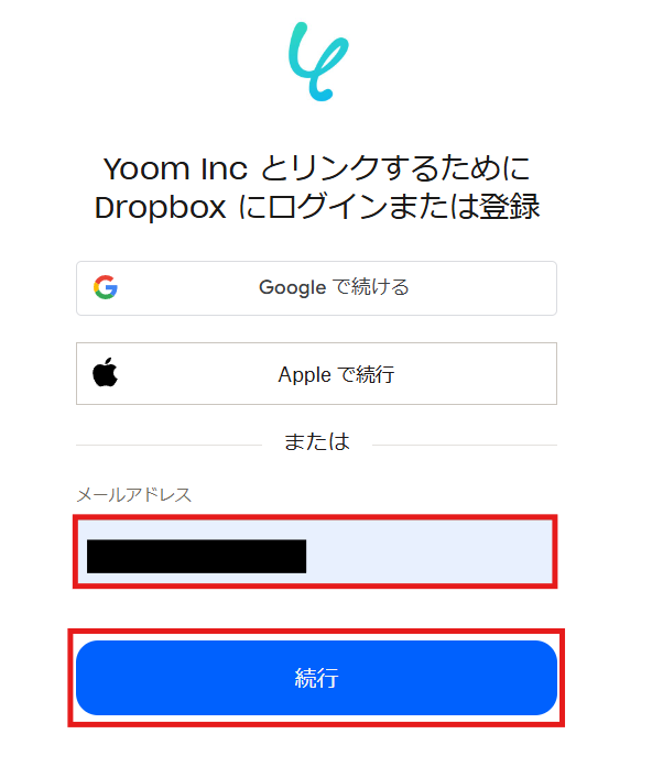 (2)Yoomと連携するDropboxアカウントのメールアドレスを入力し、「続行」をクリックします。