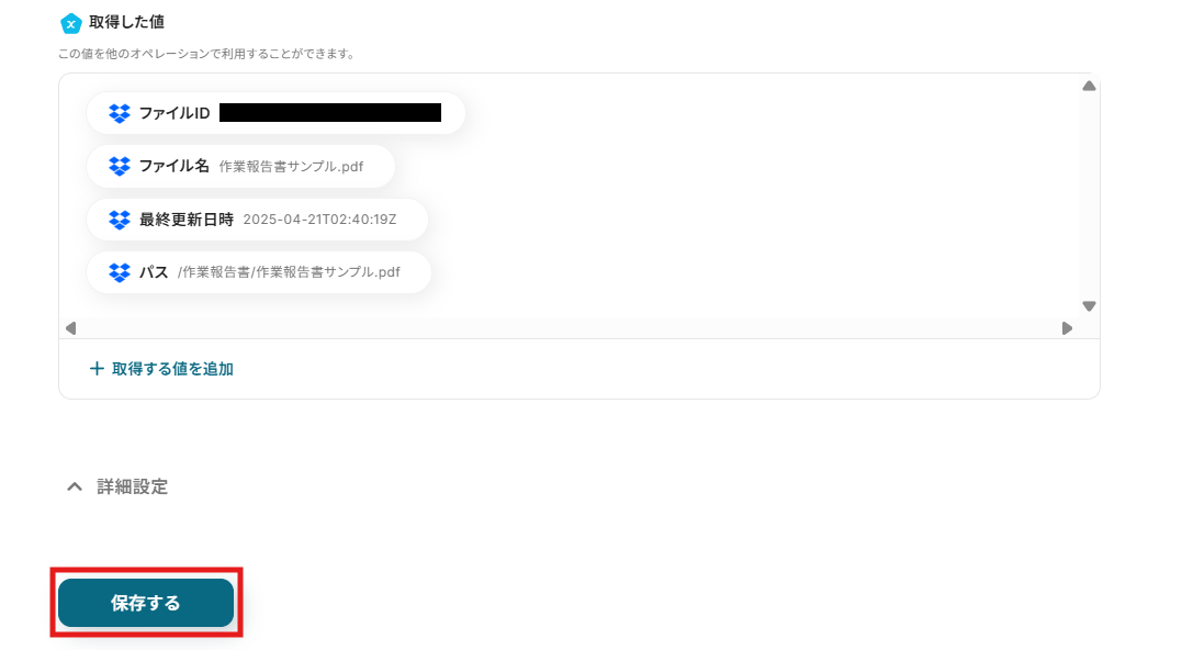 (6)テストが成功すると、「取得した値」に先ほどアップロードしたファイルの情報が抽出されます。