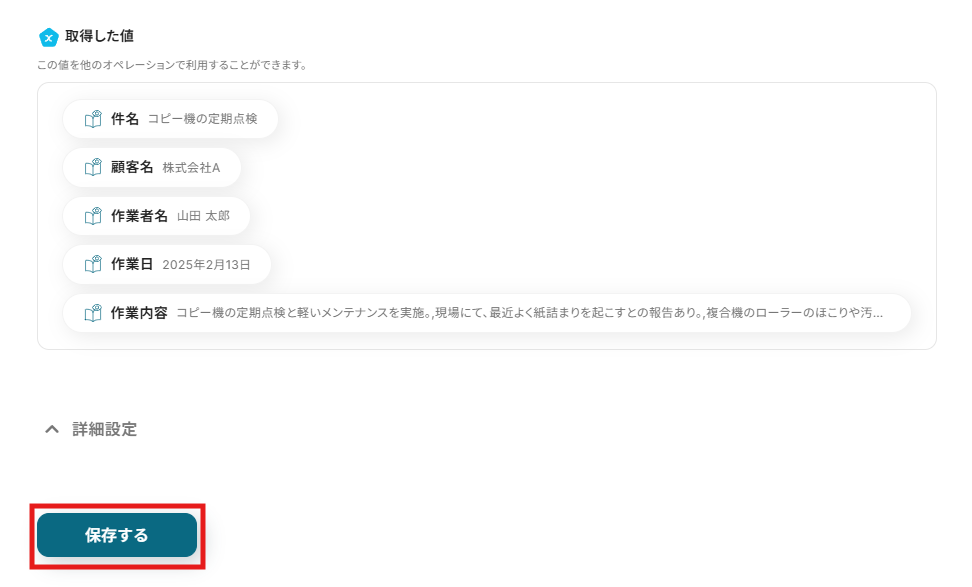 正しくファイルの情報が抽出できていることを確認し、「保存する」をクリックして設定完了です!
