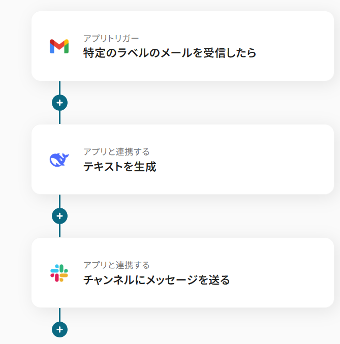 ここでは、例として「Gmailで特定のメールを受信したら、その内容をDeepSeekでテキスト抽出し、結果をSlackに通知する」フローの作成手順を解説します。 このフローを使えば、メールの内容確認や情報抽出の手間を削減できるはずです。