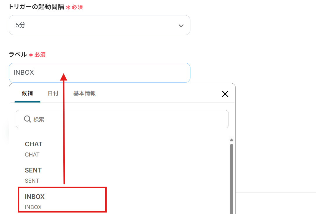 ラベル :今回は受信メールすべてを対象にしたいので、受信ボックスにあたるINBOXを選択します。