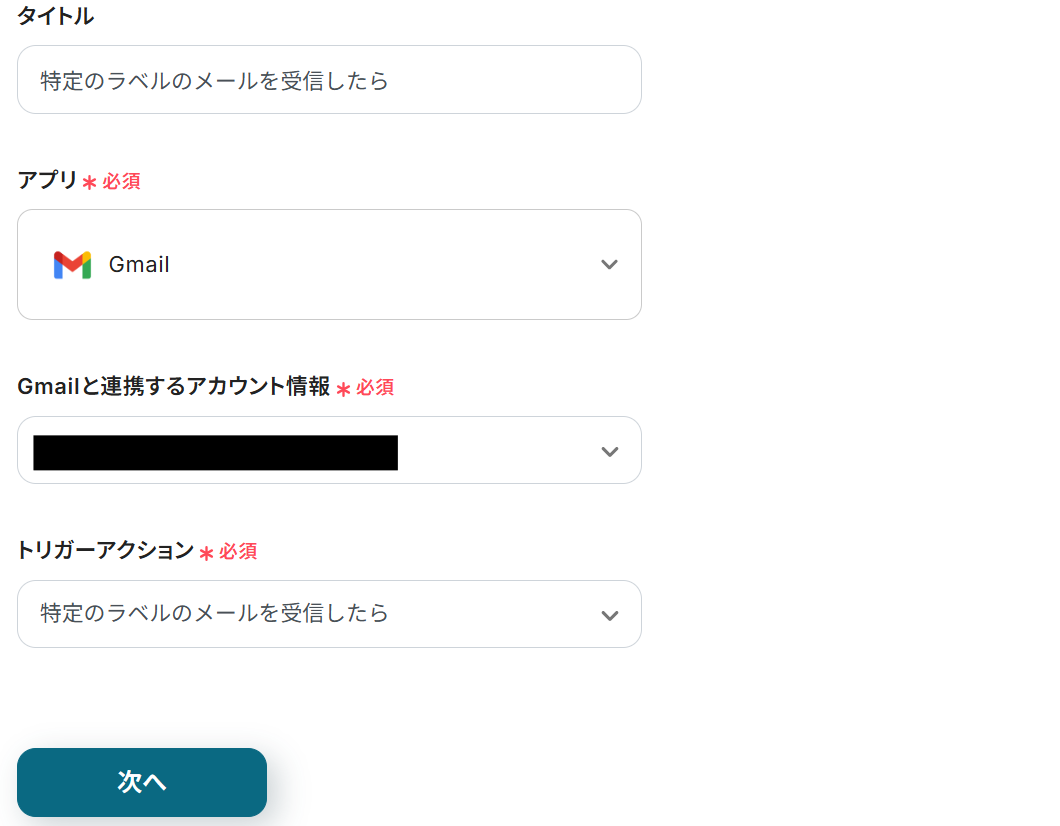 タイトルと連携するアカウント情報を任意で設定し、アクションはテンプレート通りのまま「次へ」をクリックして進んでください。