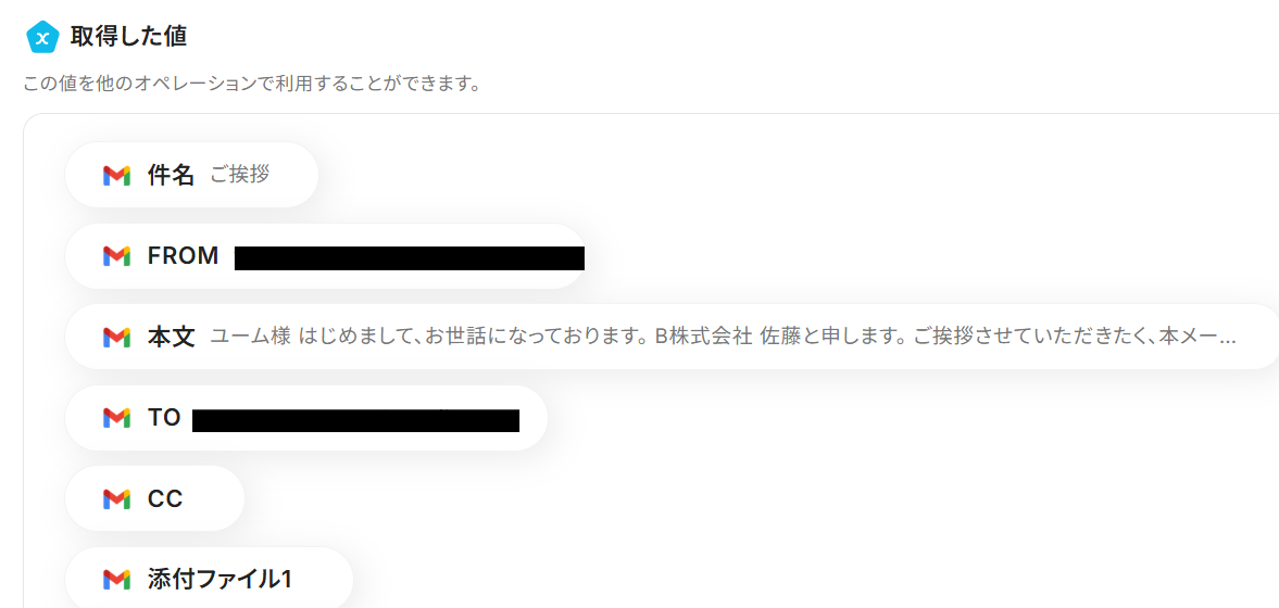 正しく連携できていると、画面下部のアウトプットにメール情報が表示されます。 このアウトプットをこのあとのアクション設定時に利用します。