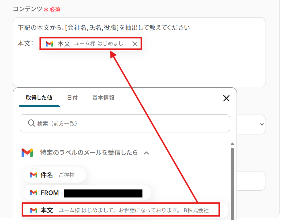 メッセージ :アウトプットから選択してください。 ※アウトプットから選択した項目は赤枠のように表示されます。 値を引用している印なので、これによってトリガーで取得した値をそのまま利用できます。 トリガーから取得した項目は手入力せず、必ずアウトプットから選択してください。