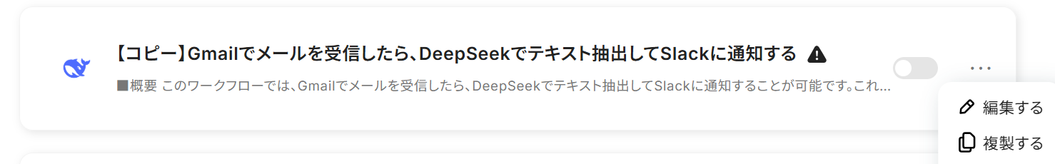 以下の画像が表示されたら、トリガーをONにしてください。 これですべての設定が完了したので、Gmailでメールを受信したら、DeepSeekでテキスト抽出してSlackに通知されるかを確認してみましょう。