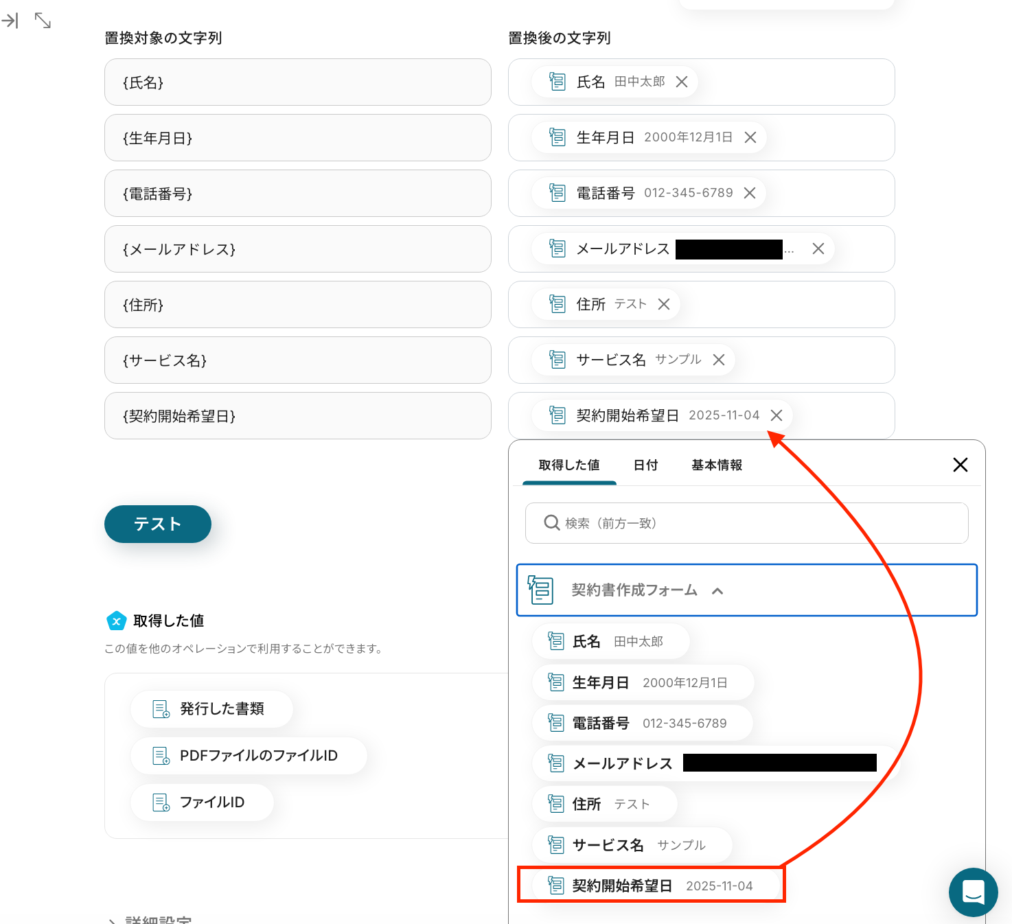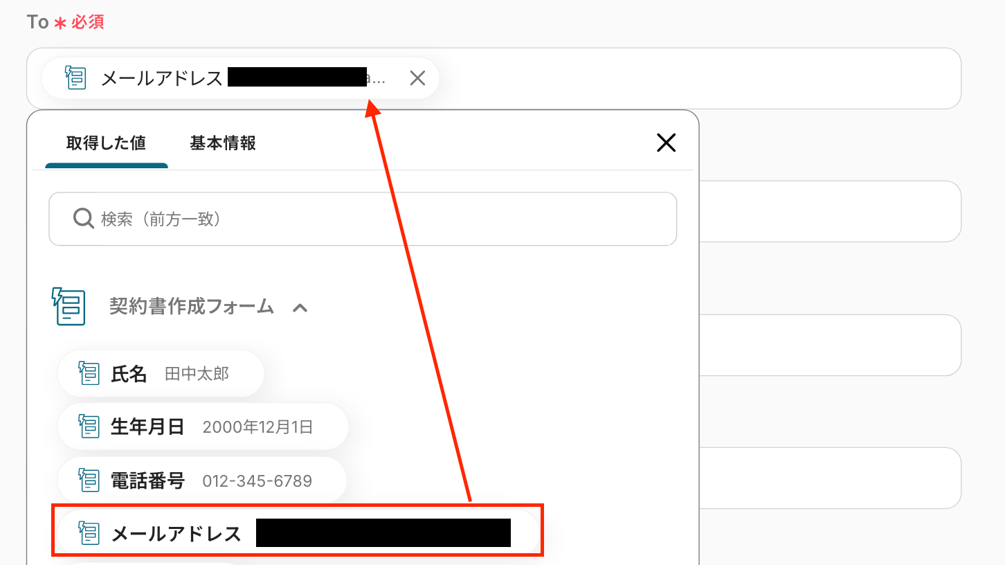 下図のように入力欄をクリックして表示される取得した値を引用した設定が可能です。