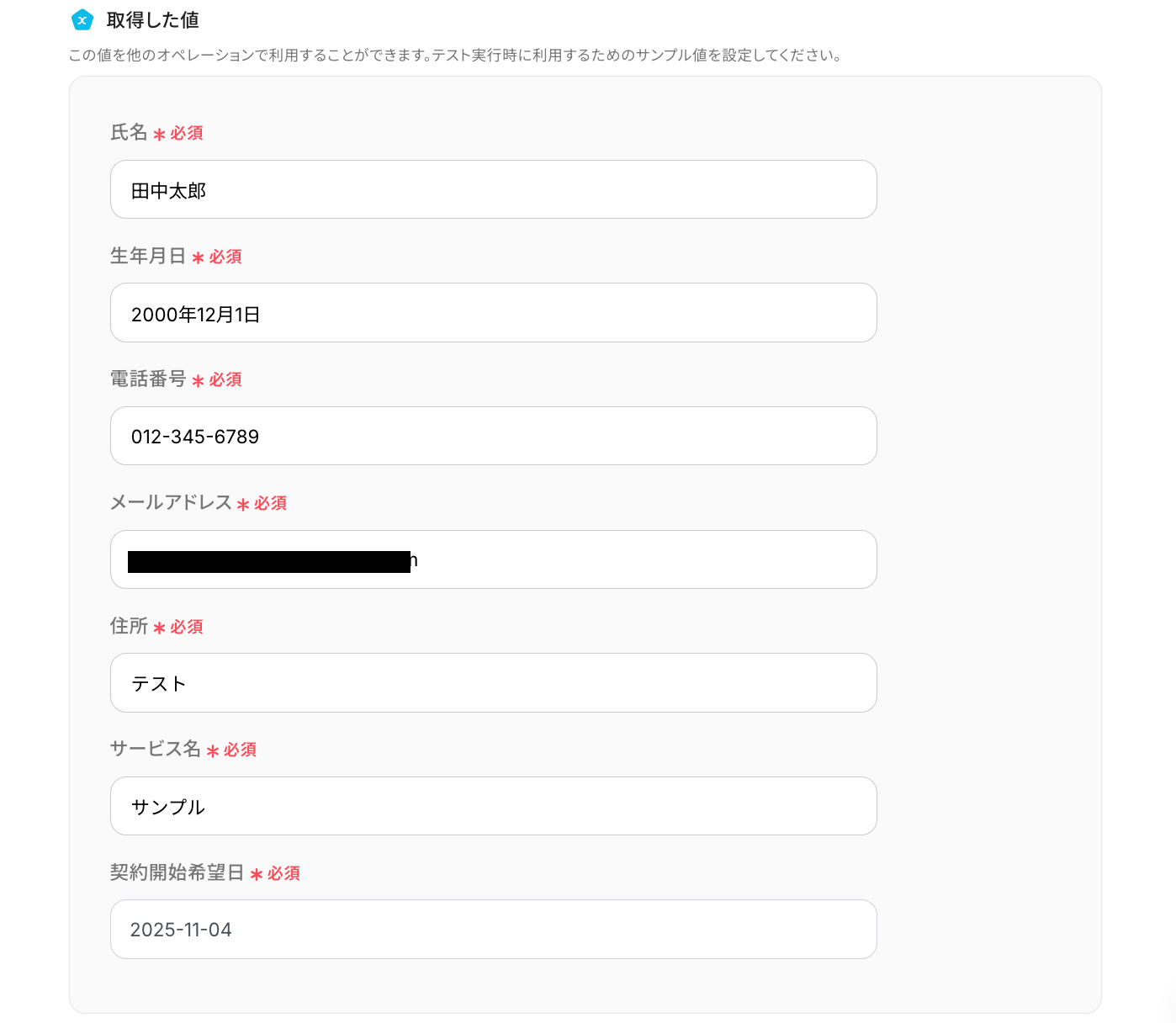 トリガーやオペレーション設定時に、「テスト」を実行して取得した値のことを指します。