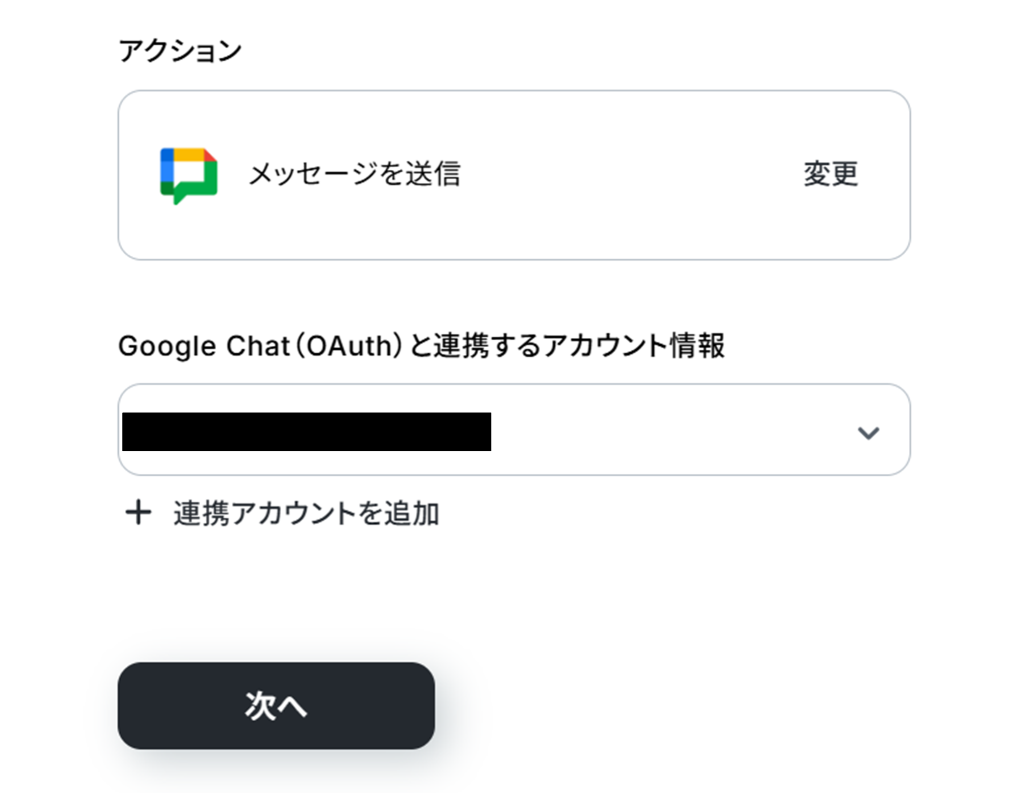 (2)「連携アカウントとアクションを選択」画面から、Google Chatと連携するアカウント情報に誤りがないかを確認し、アクションは「メッセージを送信」のままで「次へ」をクリックしましょう。