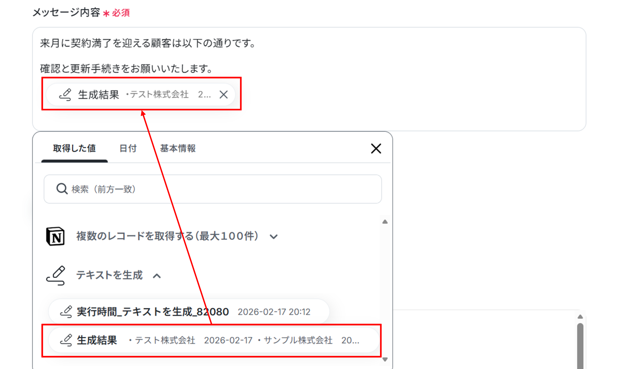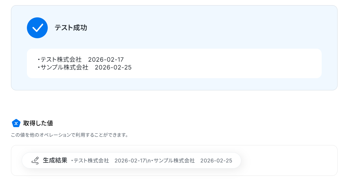 テストに成功すると、取得した値に「生成結果」が追加されます。
