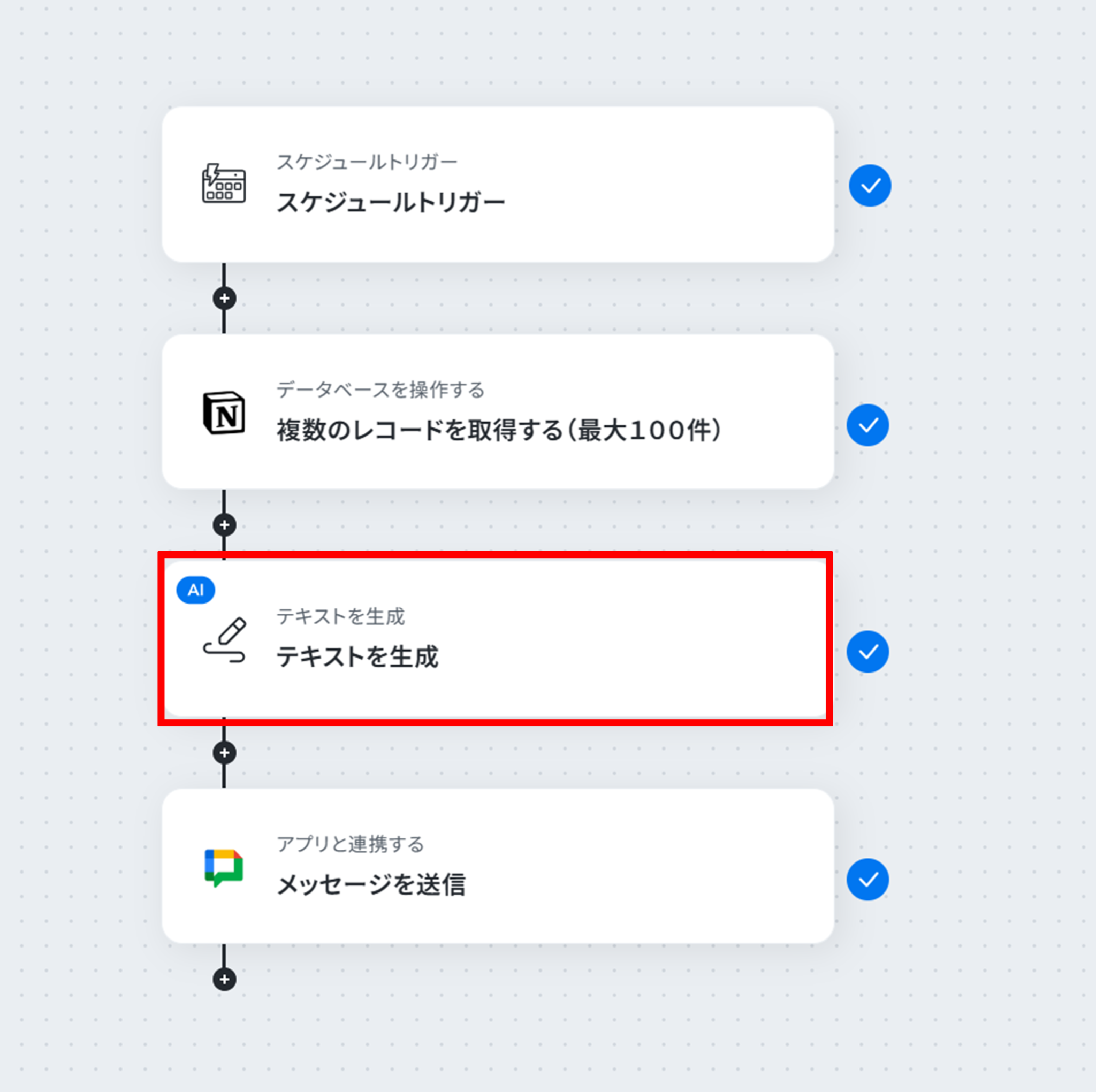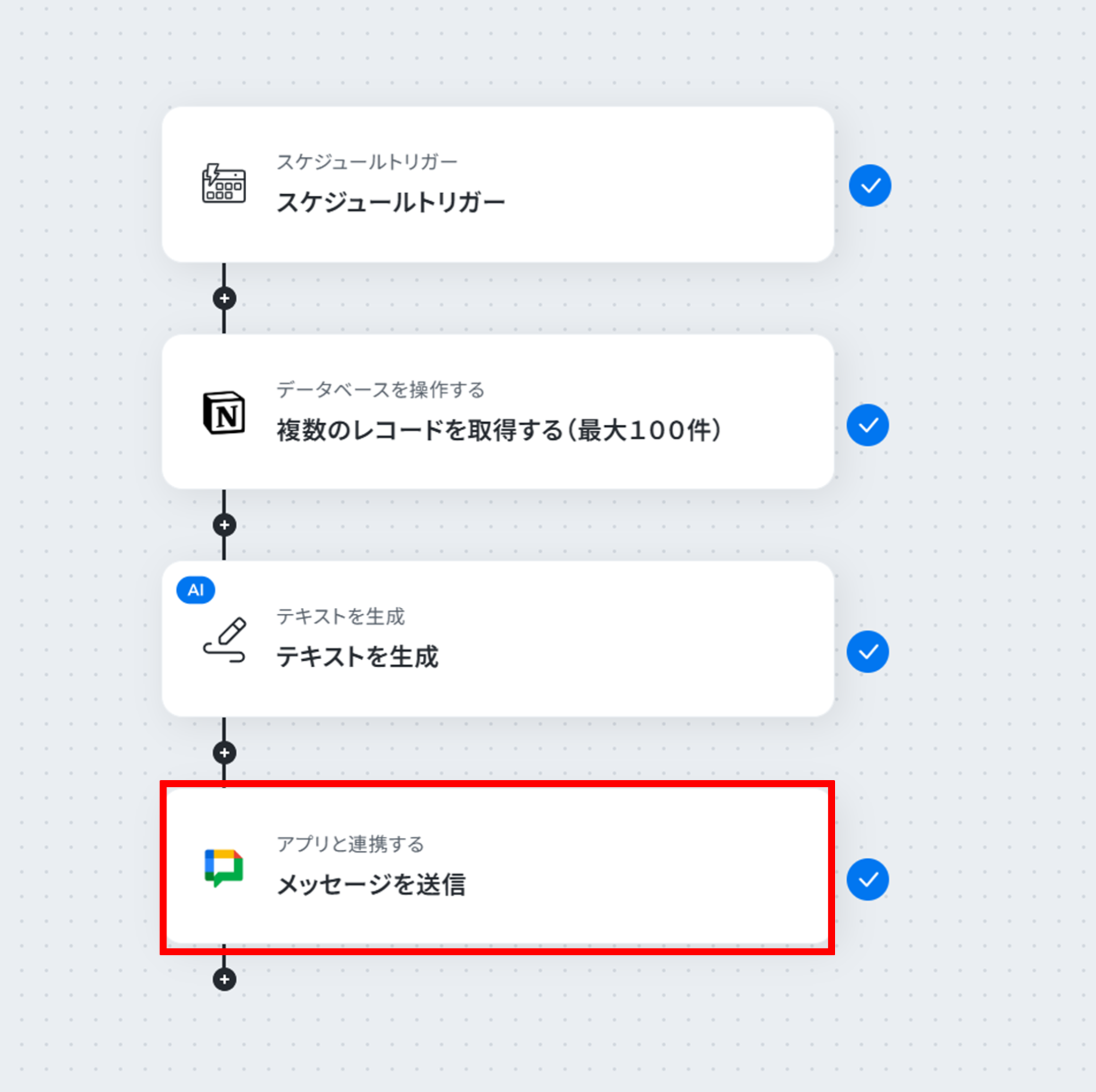 - 最後に、Google Chatの「メッセージを送信」アクションを設定し、AIが生成したテキストを指定のスペースに送信します。