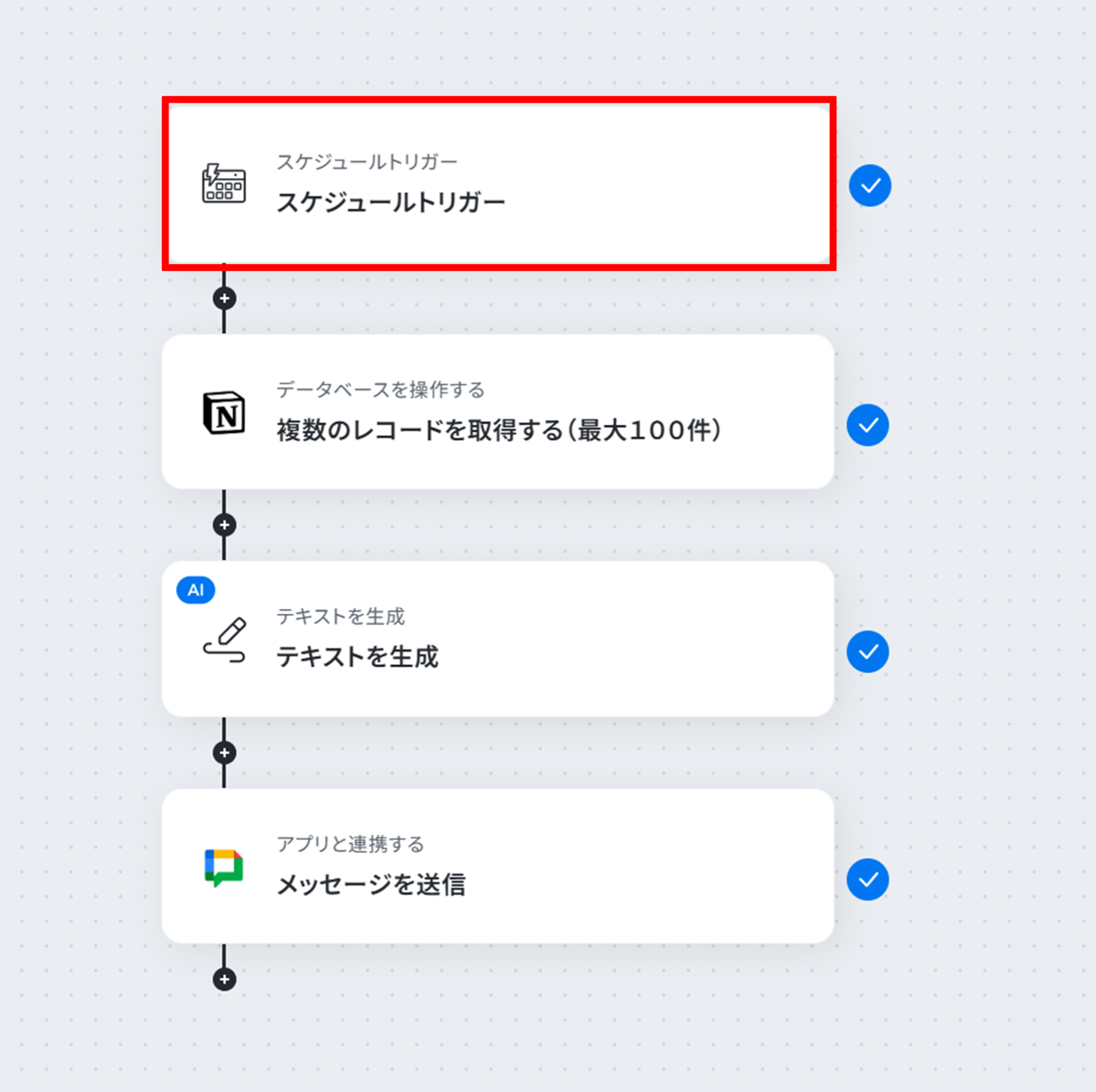 - スケジュールのトリガー設定とNotion、Google Chatのアクション設定
