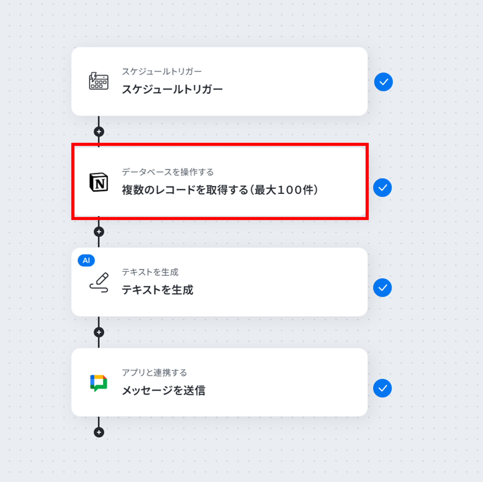 それではここから代表的な例として、指定した日時にNotionで管理しているデータベースから契約更新が近いリストを自動で取得し、Google Chatに通知するフローを解説していきます!