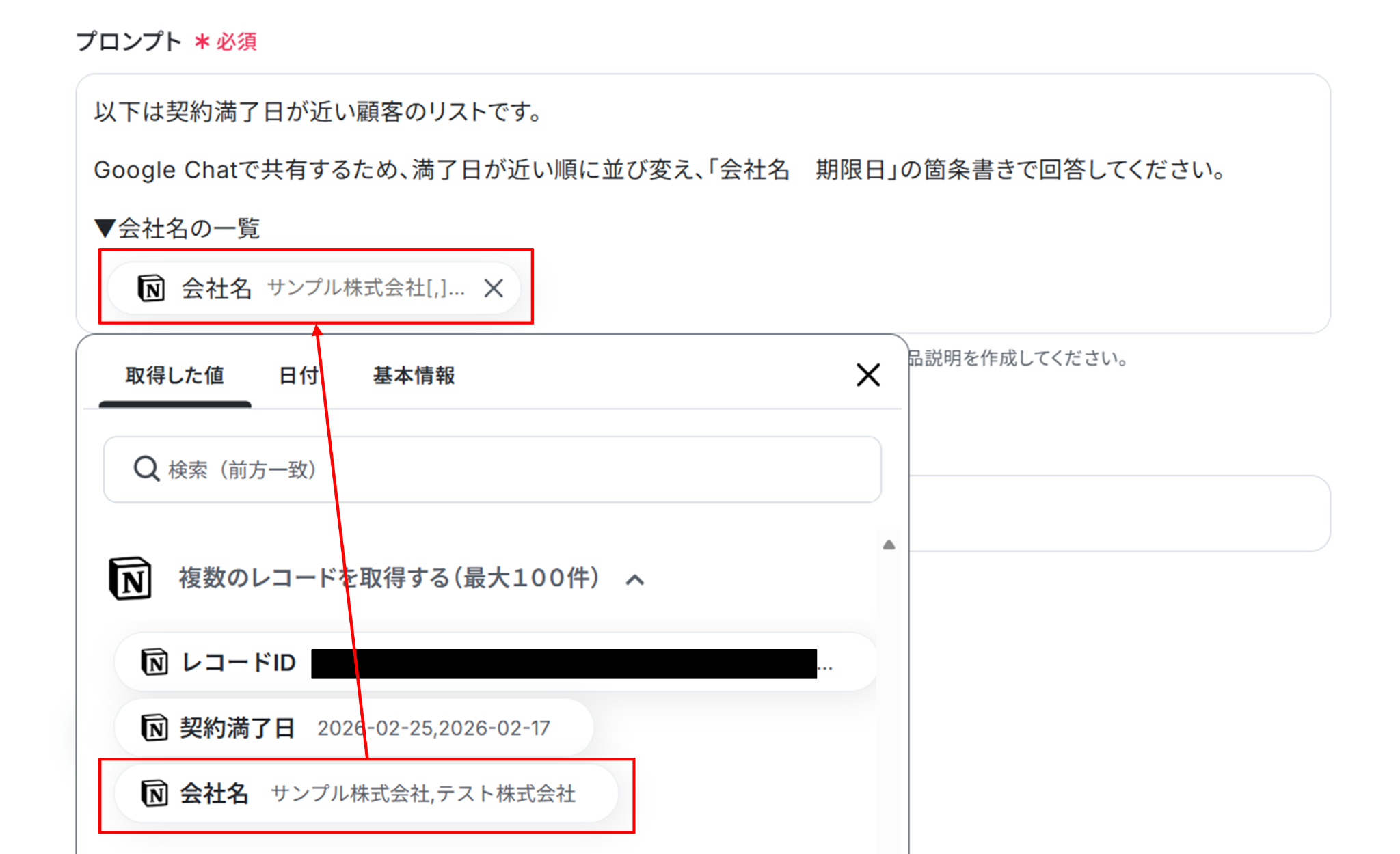 (2)「プロンプト」にNotionで取得した値を使って指示内容を入力します。