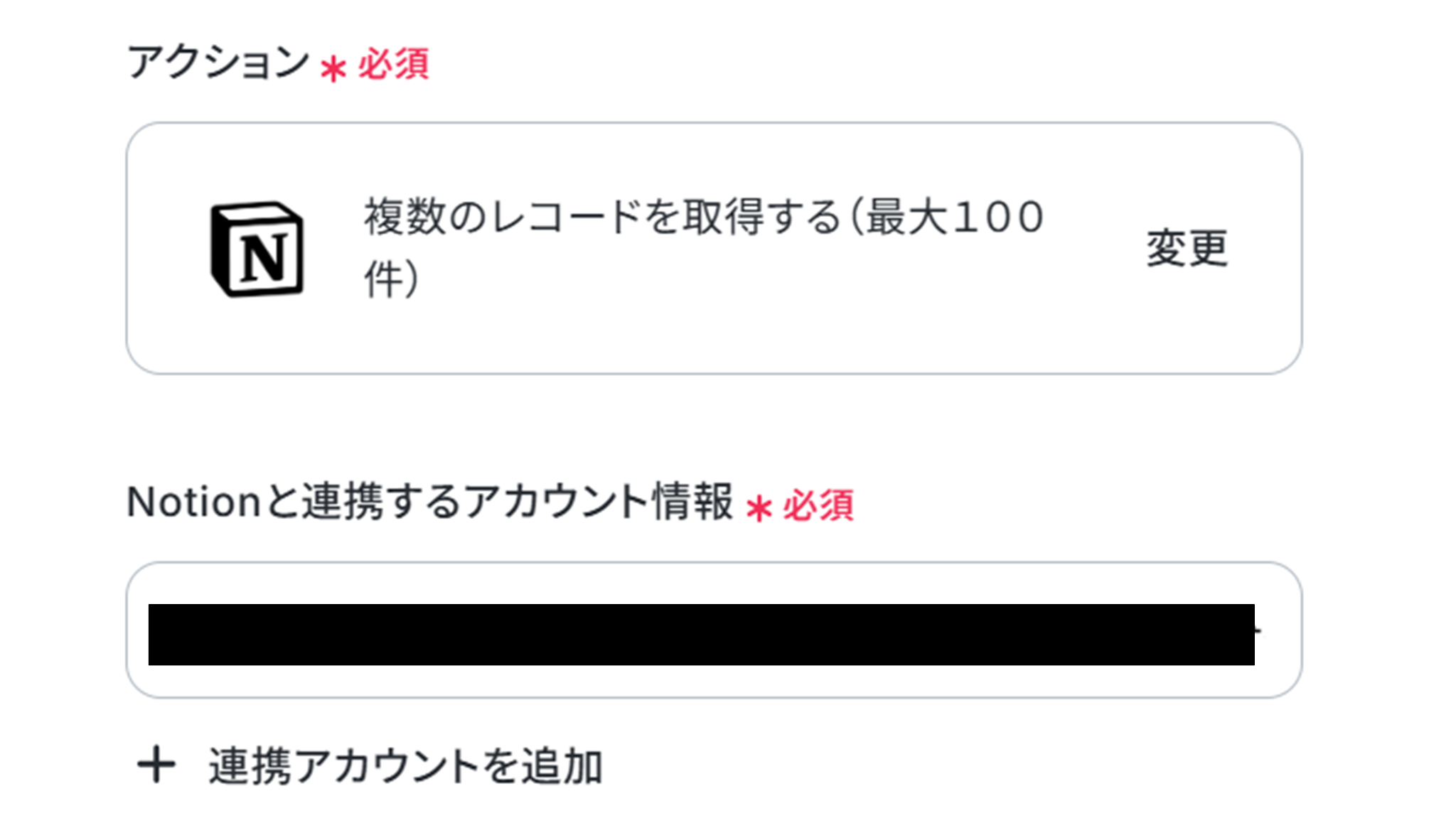 (2)「データベースの連携」画面から、Notionと連携するアカウント情報に誤りがないかを確認し、アクションは「複数のレコードを取得する(最大100件)」のまま下へ進みます。