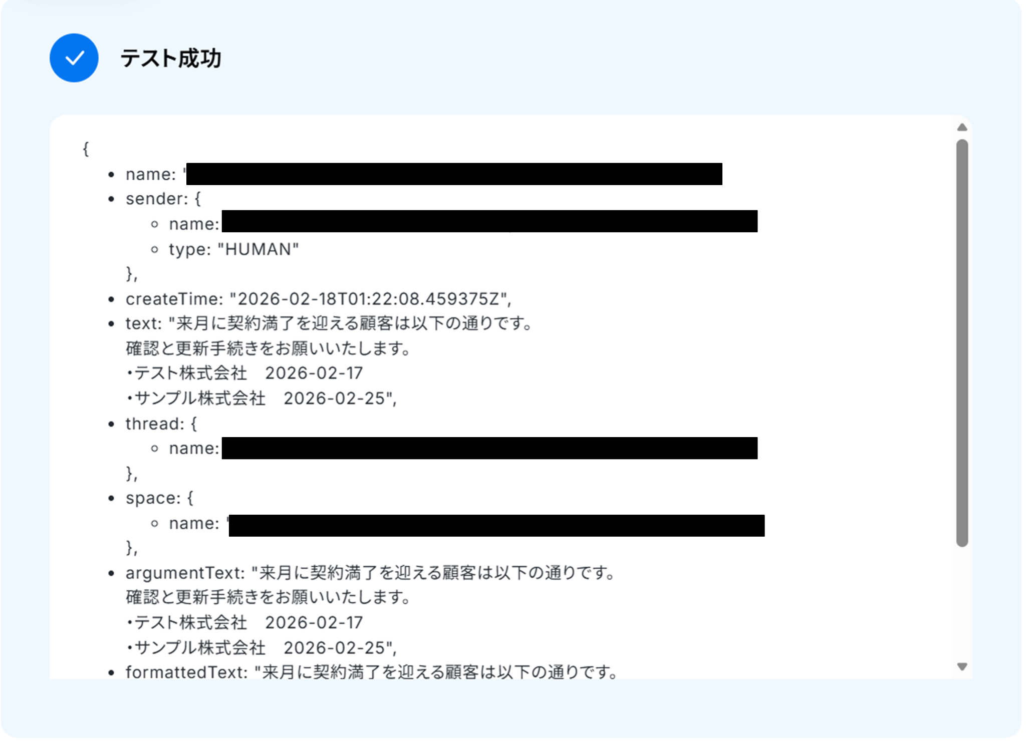 実際にフローボットを起動して、指定日時にNotionから契約更新リストを取得し、Google Chatに通知されているかを確認してみてくださいね!