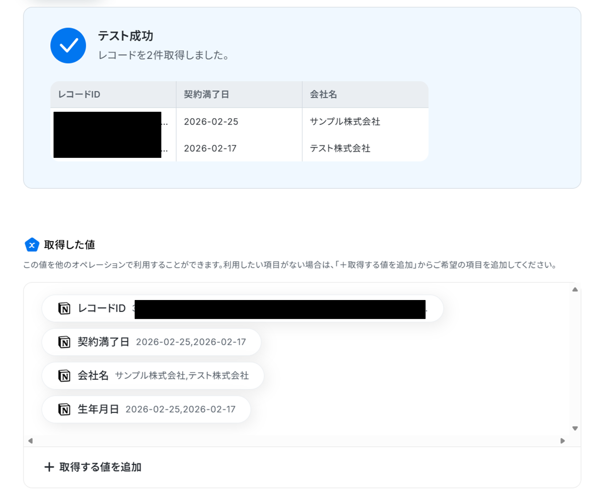 テストに成功すると、取得した値にNotionの情報が反映されます。
