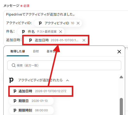 - Pipedriveで作成するアクティビティの件名や期限などの各項目には、固定のテキストを設定したり、前段のオペレーションで取得した情報を変数として埋め込んだりするカスタムが可能です