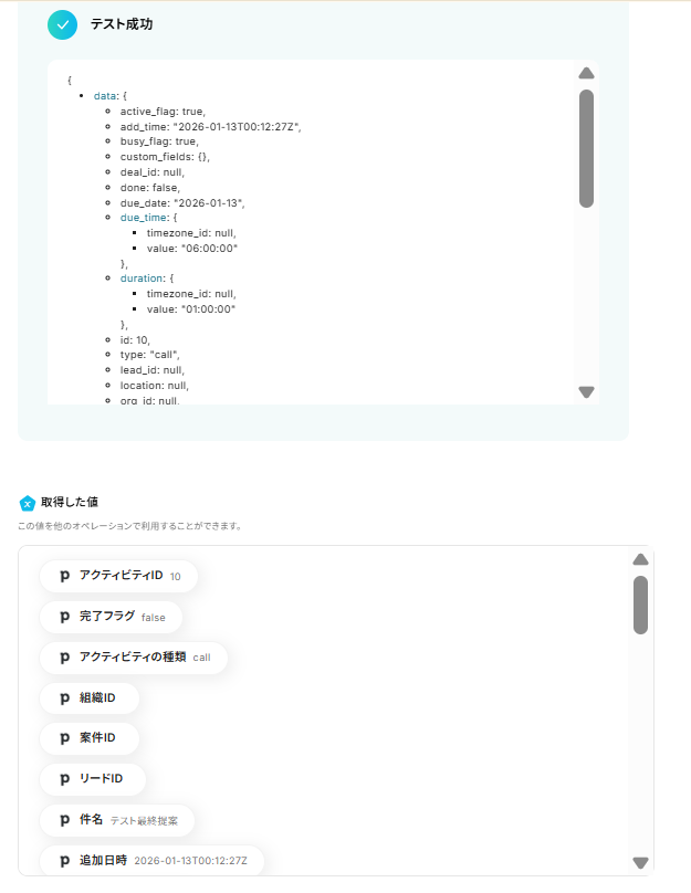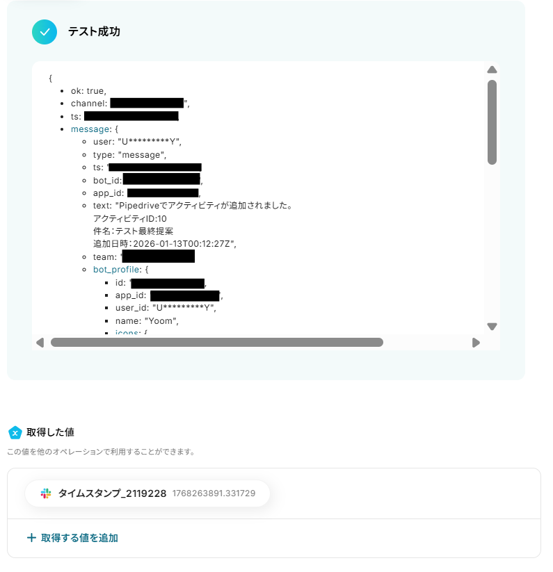 アクティビティの追加が完了したらYoom設定画面に戻り、テストボタンをクリックしましょう。テストが成功し、取得した値が入ればOKです。