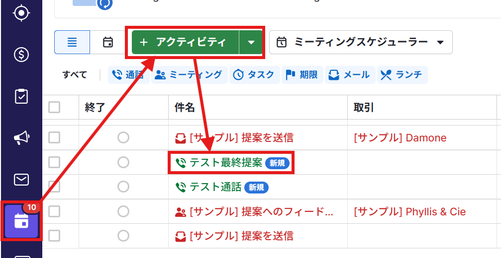 今回のWebhookイベントが「アクティビティの追加」なので、Pipedriveでアクティビティを追加します。