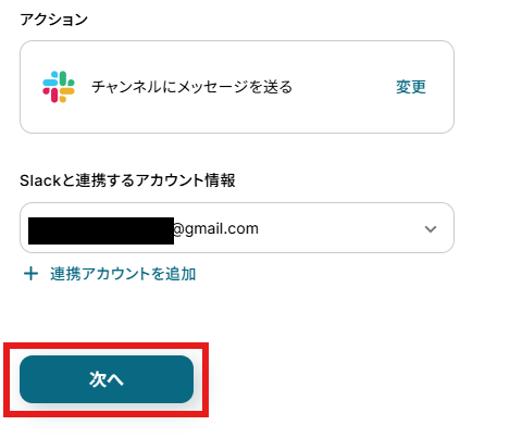 アクションはデフォルト設定のまま、アカウント情報は、連携したいアカウントが選択されているか確認してください。確認出来たら「次へ」をクリックしましょう。