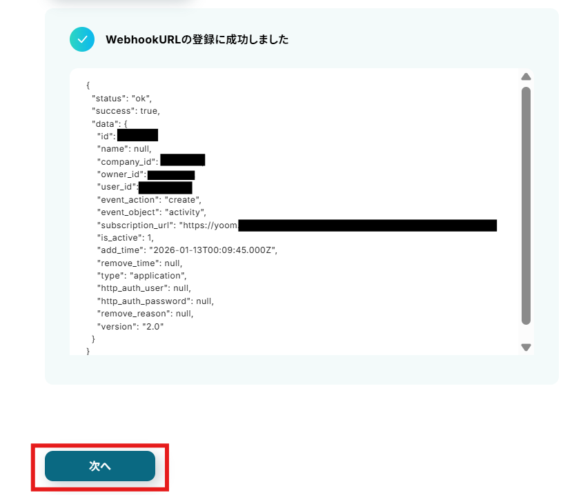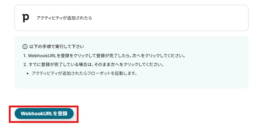 「WebhookURLを登録」をクリックし、WebhookURLの登録に成功したら「次へ」で進みましょう。