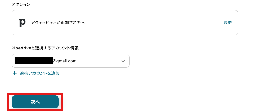 アクションはデフォルト設定のまま、アカウント情報は、連携したいアカウントが選択されているか確認してください。