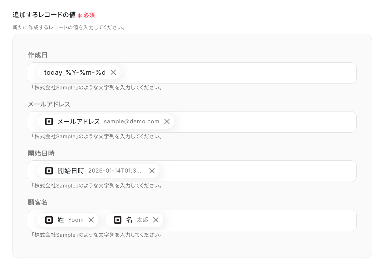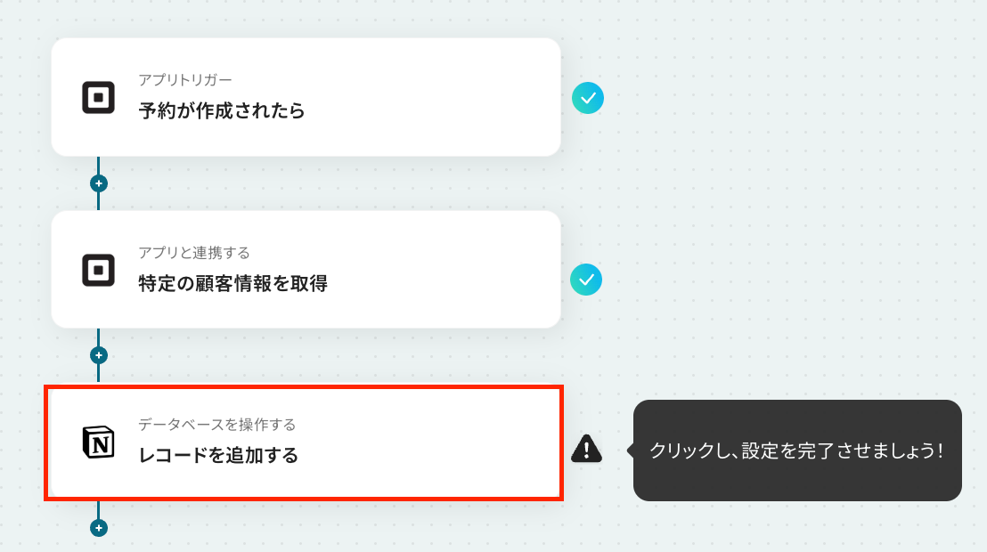 - 最後に、オペレーションでNotionの「レコードを追加する」アクションを設定し、取得した予約情報や顧客情報をデータベースに追加します。