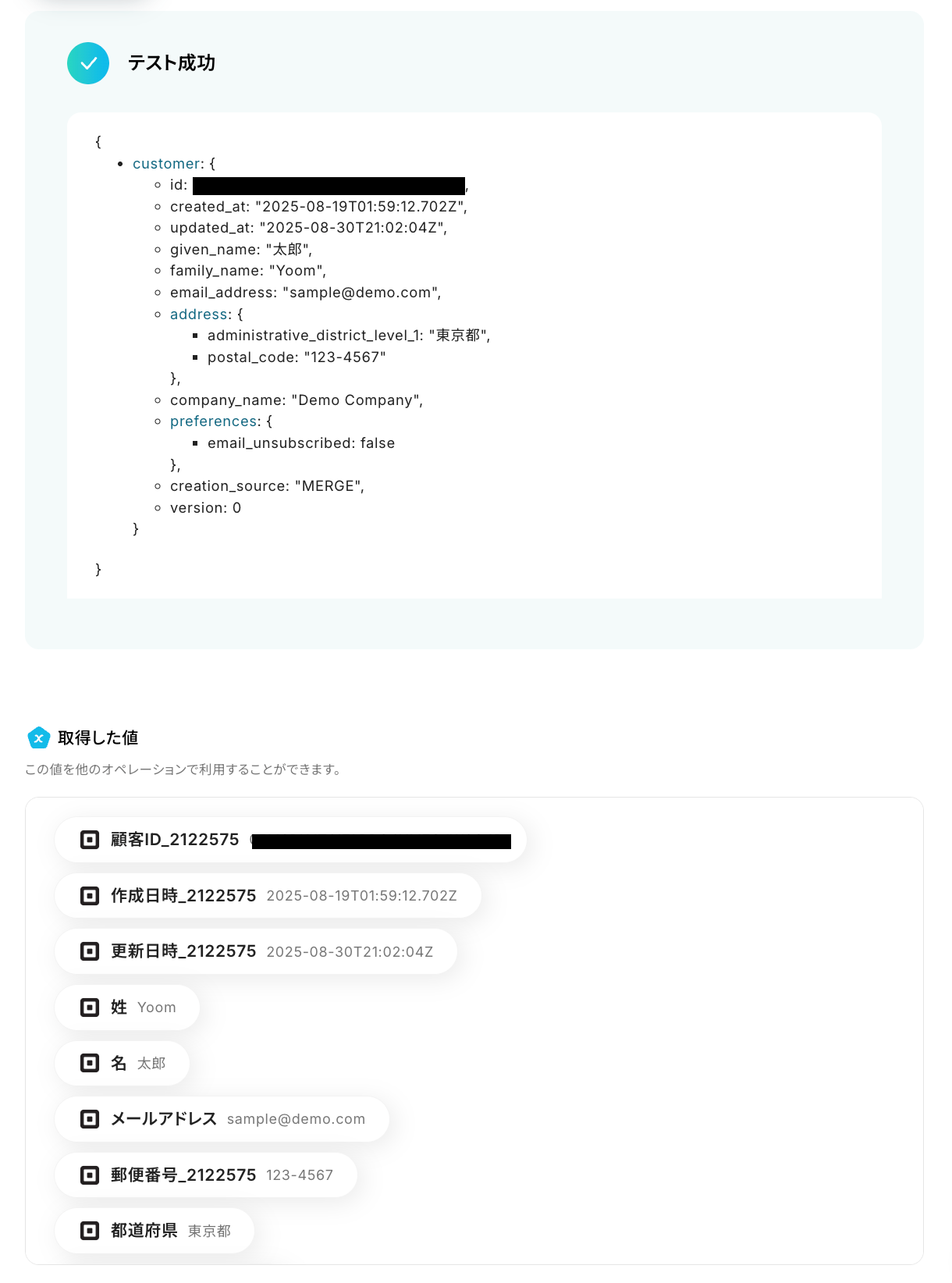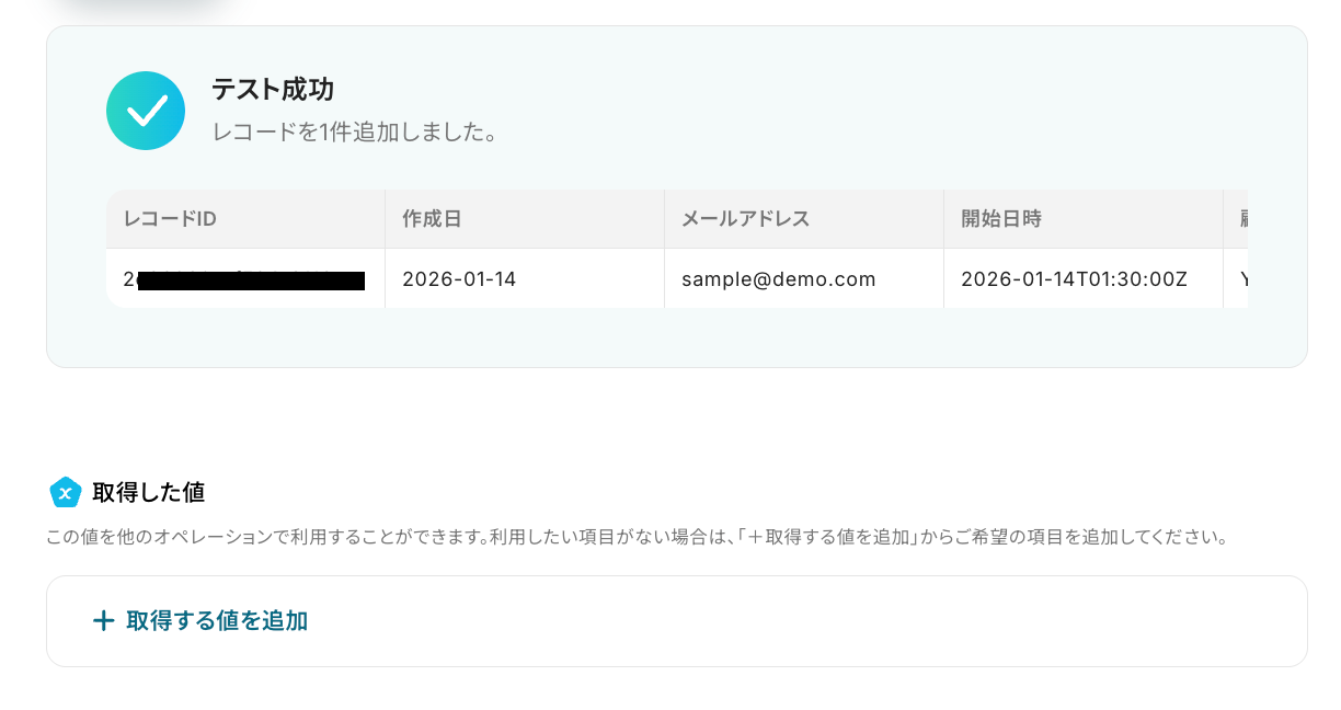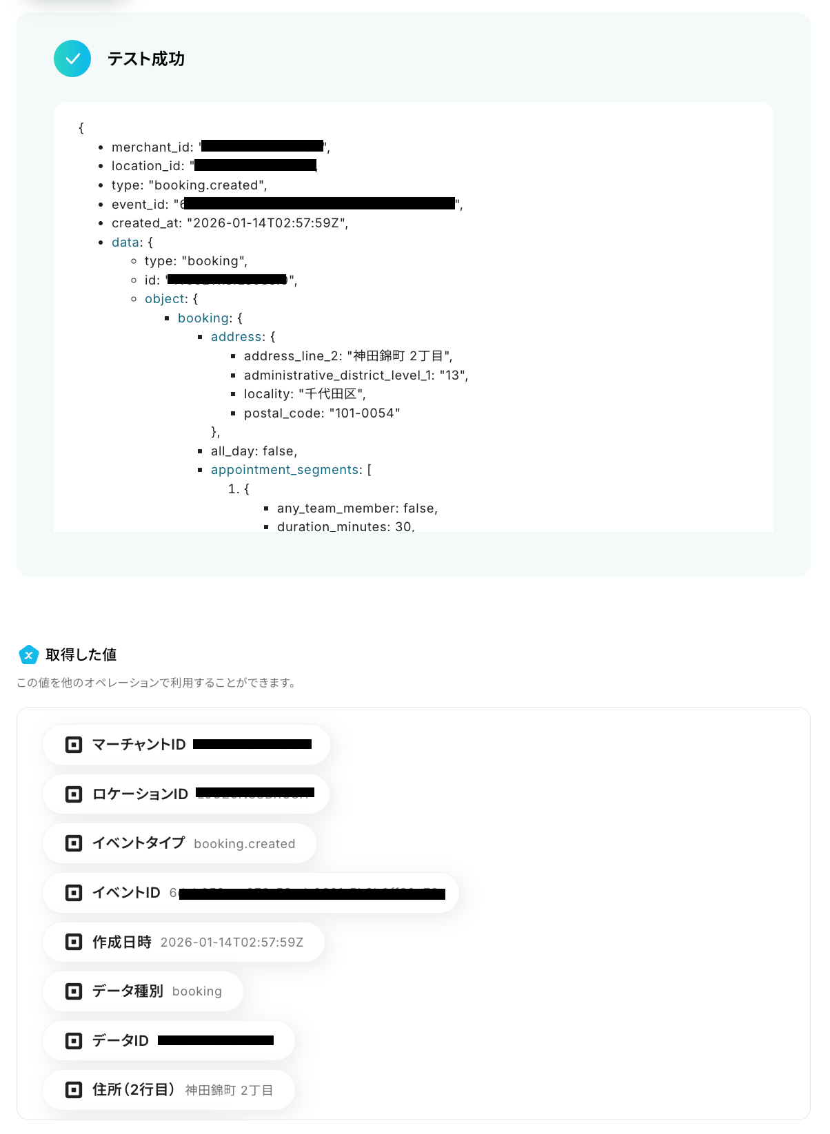 テストが成功すると、先ほど作成した予約の情報が「取得した値」に追加されるので、内容を確認しましょう。